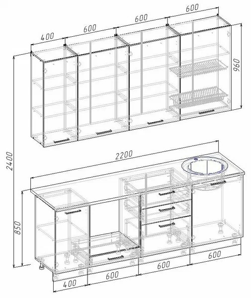 - Фасады верхних модулей со свесом – дают возможность использовать модули без установки ручек, а также установить скрытую подсветку;