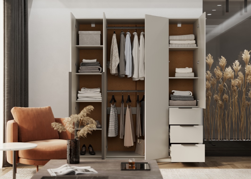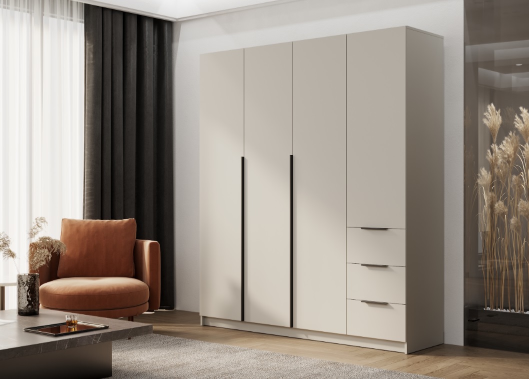 • Максимальная вместимость: Просторная конструкция с четырьмя створками и тремя выдвижными ящиками позволяет систематизировать хранение всего гардероба, от объемных вещей до мелких аксессуаров.